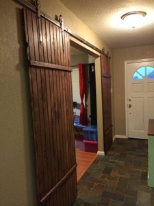 I know this has nothing to do with health or fitness…well I guess it does in a sense that you must be in good health to do what my husband just did for me this weekend! When we knew we had Race on the way, we had to move our “office” from the front bedroom into our other living area. We have a 3 BR/2 LR house…it’s not huge my any means, but we are lucky to have two living areas! So. With us moving our office/craft room to the front living room, it is literally the first thing you see when you walk in our front door. And although I am a clean maniac (yes, I clean the shower as I’m showering!), a craft room can only be so clean with projects on going and with an office space that my husband uses daily since he works for himself. I needed some sort of door to cover the entry to that room…my first thought: French doors! But Brock said no because they had to swing open and it wouldn’t work with what we’ve got going. Ok. Next: pocket doors! Again, Brock said no because you would have to go into the sheet rock and headers and 2x4s and blah, blah, blah (crap I don’t understand). So finally I came up with…sliding barn doors. Well. He said “eh!”…not a no, I’ll take it!